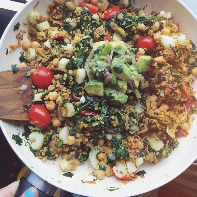 2) Hinzu kommen jetzt alle weiteren Zutaten; Staudensellerie, Zwiebel und Cherrytomaten zuvor klein schneiden. Die Gemüsepfanne ein wenig schmoren bzw. köcheln lassen und ganz zum Schluss frische Avo und Koriandergrün dazugeben.